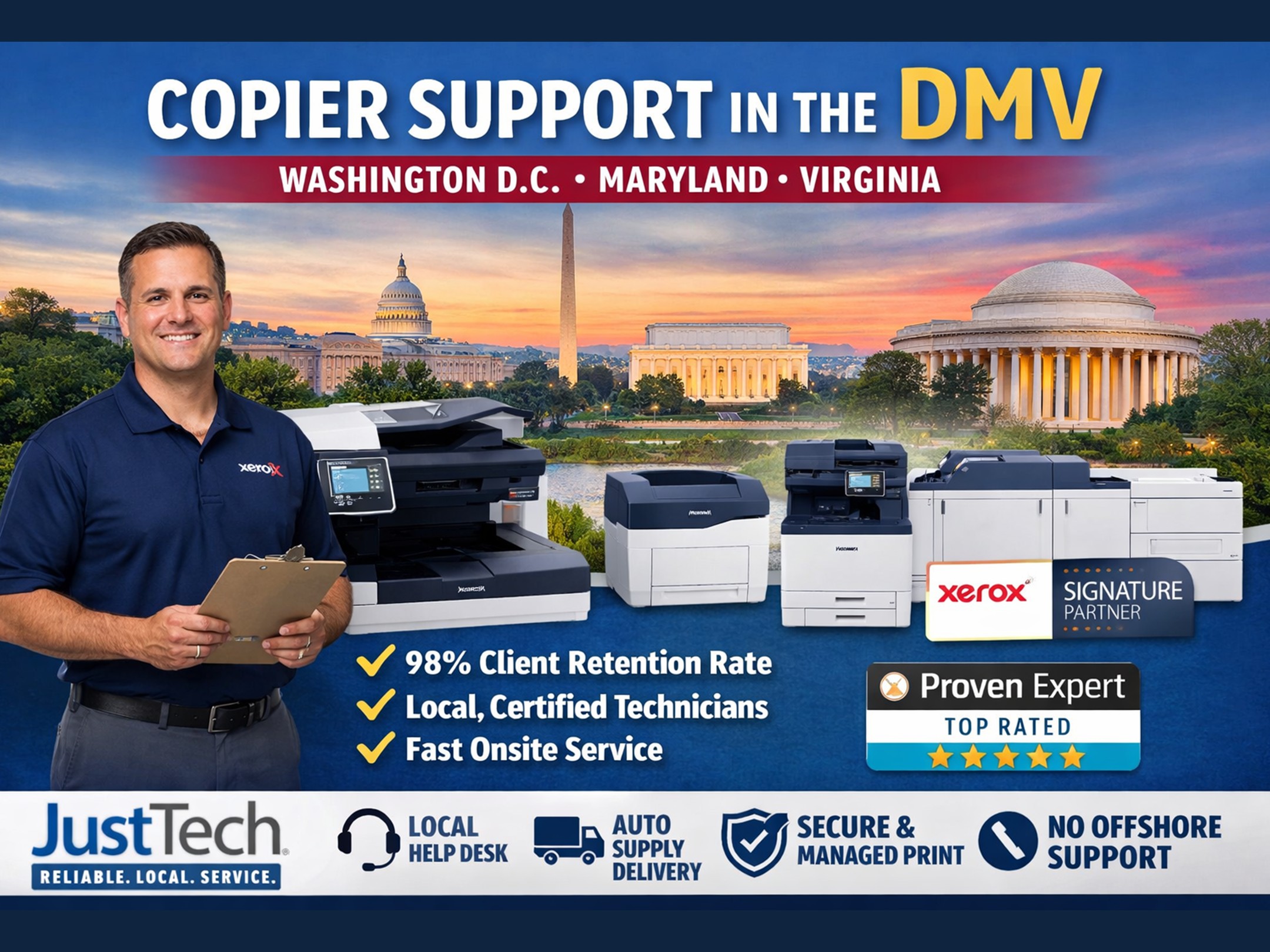 When businesses search for copier support in the DMV (Washington, DC, Maryland, and Virginia), they need more than just equipment—they need a responsive, local partner that ensures uptime, security, and long-term reliability. That’s where JustTech stands apart. With a 98% client retention rate, JustTech has built a reputation as a